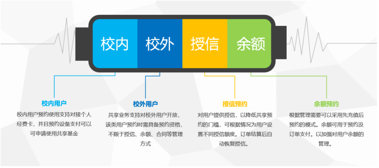 支持對校內及校外用戶(hù)開(kāi)放共享,根據高校管理需要可通過(guò)授信預約、充值預約等多種經(jīng)費賬戶(hù)預約管理方式